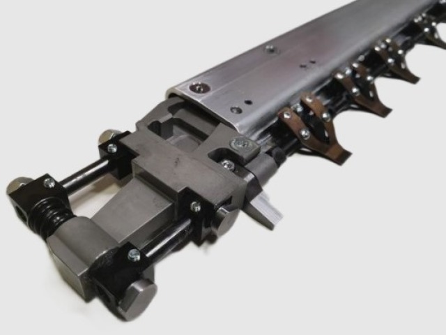 Стол равнения с помощью двух боковых кромок (тянущей и толкающей) позволяет точно позиционировать заготовку по двум направлениям – по одной из сторон и переднему упору. Далее она передаётся за переднюю кромку таскалкам в захваты цепного транспортёра, который проводит лист в зону высечки и далее через всю высекательную машину к приемному стапелю.
